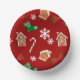 Festive Red Christmas paper bowls that feature snowflakes, candy canes, gingerbread houses, bows, and Christmas stockings.