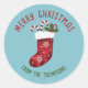 Red Christmas Stocking On Blue With Custom Text Classic Round Sticker