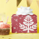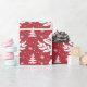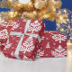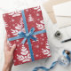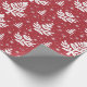Brightly coloured wrapping paper brings holiday cheer, featuring whimsical white trees, snowflakes, and decorative elements. Perfect for wrapping gifts during the festive season.