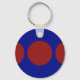 This bold geometric pattern features a red circle in the centre and two red half circles on the edges of a blue background.