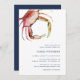 Coastal chic bridal shower invitation features a vintage style watercolor red crab illustration, with your bridal shower details in classic navy blue. Perfect for beach, summer, or nautical theme bridal showers, these coastal style invitations reverse to solid navy blue.