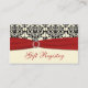 This cream, red, and black damask gift registry enclosure card matches the invitation and other items shown below.