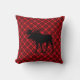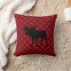 The front of this throw pillow has a black silhouette bull moose image on a black cross check pattern with a bright red background. The back of the pillow has the same pattern without the moose image. Perfect for a cabin or woodland home. Thanks to Ephrazy Design for the print graphic.