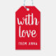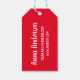 Simple custom red gift tags. The font style and size can be changed by clicking on "customize further." The text on the back can be changed into a personal message or can be deleted.