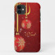 Beautiful deep red damask and Christmas ornaments on gold ribbons with customizable text. Use the Form Factor option to apply this image to other device cases.