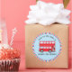 Thank you stickers with a red double decker bus inspired by the vintage London buses. Perfect for the London or bus themed birthday party. Blue, red and white stripes for decoration in the background. Personalize with your party message.