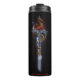 A small red dragon perches atop a gleaming fantasy sword mounted against a black wall. The dragon’s tail coils gracefully down the length of the blade, drawing the eye with its fluid motion and subtle menace. The sword itself emits a soft, ethereal glow