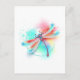 Red, flying, artistically drawn, in bright colours with textured iridescent, blue wings on white background, painted over with splashes of watercolor paint. Bright red dragonfly.