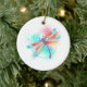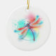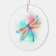 Red, flying, artistically drawn, in bright colours with textured iridescent, blue wings on white background, painted over with splashes of watercolor paint. Bright red dragonfly.