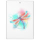 Red, flying, artistically drawn, in bright colours with textured iridescent, blue wings on white background, painted over with splashes of watercolor paint. Bright red dragonfly.