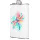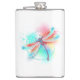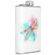 Red, flying, artistically drawn, in bright colours with textured iridescent, blue wings on white background, painted over with splashes of watercolor paint. Bright red dragonfly.