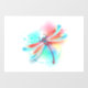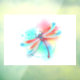 Red, flying, artistically drawn, in bright colours with textured iridescent, blue wings on white background, painted over with splashes of watercolor paint. Bright red dragonfly.