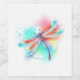 Red, flying, artistically drawn, in bright colours with textured iridescent, blue wings on white background, painted over with splashes of watercolor paint. Bright red dragonfly.