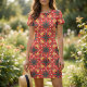 Modern trendy fabric design featuring a seamless pattern in ethnic style made of geometric shapes in red, orange, white, grey and black.
