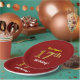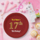 This simple, personalized, birthday-themed paper plate design features a customizable message like "First-Name’s 17th Birthday!", where the name can be changed, and with the "17th" having a faux/imitation gold-like appearance. It also features a red coloured background. Paper plates like these could perhaps be used at a party being held to celebrate somebody’s seventeenth birthday. [~Z0000144]