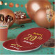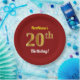 This simple, customizable, birthday-themed paper plate design features a customizable message like "FirstName’s 20th Birthday!", where the name can be changed, and with the "20th" having a faux/imitation gold-like appearance. It also features a red coloured background. Paper plates like these could perhaps be used at a party being held to celebrate somebody’s twentieth birthday. [~Z0000144]