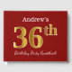 This guest book design features the ordinal number "36th" with a faux/imitation gold-like appearance. It also features a personalized name, and a red coloured background. It could be used at a party for somebody celebrating their thirty sixth birthday. [~Z0000055]
