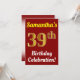 This birthday party invitation design features a message like "Samantha’s 39th Birthday Celebration!", where the name can be customized, and where the number "39th" has a faux gold-like appearance. It also features a red coloured background. The event details on the back can be customized. It could be used to invite people to somebody’s thirty ninth birthday celebration or birthday party. [~Z0000120]