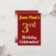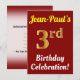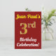 This birthday party invitation design features a message like "Jean-Paul’s 3rd Birthday Celebration!", where the name can be personalized, and where the number "3rd" has a faux gold-like appearance. It also features a red coloured background. The event details on the back can be personalized. It could be used to invite people to somebody’s third birthday celebration or birthday party. [~Z0000120]