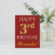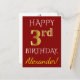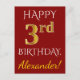This simple, personalized birthday postcard design features the message "HAPPY 3rd BIRTHDAY", with the "3rd" having a faux gold-like appearance. The front also features a personalized name, and a red background. The back features a customizable birthday greeting message, along with the customizable address of the birthday postcard recipient. It could be sent to somebody who is celebrating their third birthday. [~Z0000071]