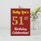 This birthday party invitation design features a message like "Betty-Lou’s 51st Birthday Celebration!", where the name can be customized, and where the number "51st" has a faux gold-like appearance. It also features a red coloured background. The event details on the back can be customized. It could be used to invite people to somebody’s fifty first birthday celebration or birthday party. [~Z0000120]