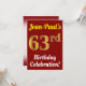 This birthday party invitation design features a message like "Jean-Paul’s 63rd Birthday Celebration!", where the name can be personalized, and where the number "63rd" has a faux gold-like appearance. It also features a red coloured background. The event details on the back can be personalized. It could be used to invite people to somebody’s sixty third birthday celebration or birthday party. [~Z0000120]