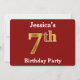 This invitation design features the ordinal number "7th" with a faux gold-like appearance. It also features a personalized name, and a red background. The event details on the back can be personalized. It could be used to invite people to somebody’s seventh birthday party. [~Z0000012]