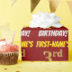 This wrapping paper design features a message like "FIRST-NAME’S 3rd BIRTHDAY!", with the "3rd" having a faux/imitation gold-like colour appearance, and with the name and "BIRTHDAY" in a fun, bold font. The name can be personalized, and the background is coloured red. Wrapping paper like this could perhaps be used when wrapping birthday gifts being given to somebody in celebration of their third birthday. [~Z0000204]