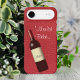 Faux red leather with a textured look. Photo generated close-up of tanned, embossed, and dyed red leather. Wine bottle tilting to the left, with french text, "'Merlot Bèbè" at top.