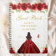 This elegant and glamourous birthday party guest book features a beautiful princess with dark hair and dark skin in a red ball gown. The text combines handwritten script and modern sans serif fonts for a classy and sophisticated look. The floral arrangements, butterflies and gold confetti create the perfect blend of rustic and chic.
