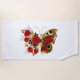 Red peacock eyed flower butterfly with red textured wing, decorated with composition of red, artistically painted roses with golden stems and leaves on white background.