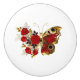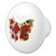 Red peacock eyed flower butterfly with red textured wing, decorated with composition of red, artistically painted roses with golden stems and leaves on white background.