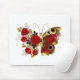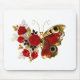 Red peacock eyed flower butterfly with red textured wing, decorated with composition of red, artistically painted roses with golden stems and leaves on white background.