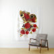 Red peacock eyed flower butterfly with red textured wing, decorated with composition of red, artistically painted roses with golden stems and leaves on white background.