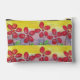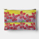 Big red flowers, green leaves and a bright yellow sky adorn this hand-painted cosmetic pouch.