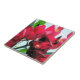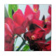 The original photograph by MaeFlowers, featured on this brightly coloured small Ceramic Tile, is a closeup of red flowers in bloom, with their long green leaves against a light blue sky background. Near the centre of the photo, one of the flowers is past full bloom, with its petals drying and curling at the edges, exposing the yellow tipped centre of the flower.