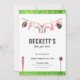 This editable football first birthday party invitation sets the tone for your football theme birthday celebration. The EMMITT Collection features a white background with a watercolor american football and the green turf with yard lines along the top and bottom, along with a down indicator and down marker. A clothesline with football faves, from a football, whistle, cleats, helmet and foam finger in red hand along the top. A pairing of sports sans serif, script and serif fonts in dark grey with all editable text completes this football kids birthday party invitation for a boy.