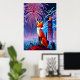 A red fox sitting on the roof in the bug city with firework over the city at New Year's Day in the background. This is a AI generated art.