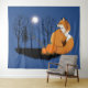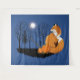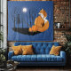 A red fox sits beside pumpkins and autumn leaves. Some Autumn leaves are flying towards the forest in behind the fox