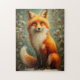 A portrait of a fox sitting in a snowy forest. The fox has bright orange fur with a white chest and tail tip. The background features pine trees covered in snow, creating a wintery atmosphere. The fox's expression is calm and serene. The overall mood is peaceful and inviting. The image is digitally created with a realistic style. Perfect for kids room.