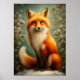 A portrait of a fox sitting in a snowy forest. The fox has bright orange fur with a white chest and tail tip. The background features pine trees covered in snow, creating a wintery atmosphere. The fox's expression is calm and serene. The overall mood is peaceful and inviting. The image is digitally created with a realistic style. Perfect for kids room.