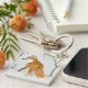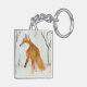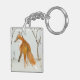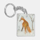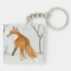 A watercolor painting of a red fox out on a hunt in the snowscape of winter adorns this keychain!