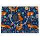 Cute red foxes with flowers and birds in a seamless pattern over blue background.