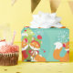 Cute and colourful holiday wrapping paper features two red foxes in earmuffs, winter hats, and striped scarves in front of a decorated Christmas tree with pretty white snowflakes.