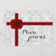 Invités Invitations à un échange de cadeaux ou à une fête de vacances avec cette boîte de cadeau de vacances fictif unique présente avec l'image de l'arc attachée, avec blanc damassé "papier d'emballage" arrière - plan avec un grand arc rouge et image ruban. C'est tellement amusant d'envelopper, de plier et de coller les boîtes-cadeaux et d'attacher des ornements en velours ou en satin tout en se préparant à donner. Cette image à arc plat est presque aussi amusante. Copyright de conception © CustomChristmasPhotoCards.com