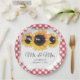 Red gingham wedding paper plates featuring sunflower flowers and string lights on a red chequered background. Matching items available to complement these rustic floral wedding paper plates. Easily personalize to any occasion.