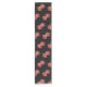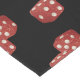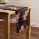 This table runner features a sophisticated and glamourous game night or casino theme. An image of red glitter dice is tiled across a black background.