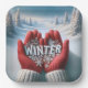 Snowflakes on red gloves on a winter woodland scene with WINTER text.