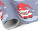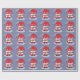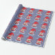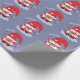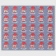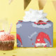 A blue-grey wrapping paper with the pattern of a charming red cartoon gnome . The word "Love" is also written in big letters .
