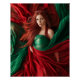 The contrast of fiery red hair against the lush green and vivid red fabric creates a captivating visual, perfect for expressing bold individuality.